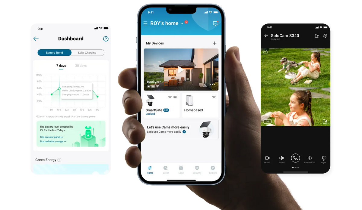 EufyのセキュリティカメラとHomeBase S380 を接続すると、AIによる顔認識で事前に登録した家族を認識するだけでなく、見知らぬ顔を検知したらアプリで自動通知。複数カメラの連携や、保存容量を拡張も可能に。