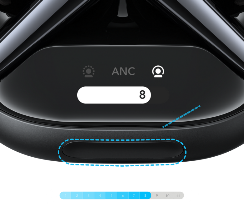ケース搭載のタッチバーで、アプリを介さずにノイズキャンセリング・外音取り込みの強度を10段階に調整できます。