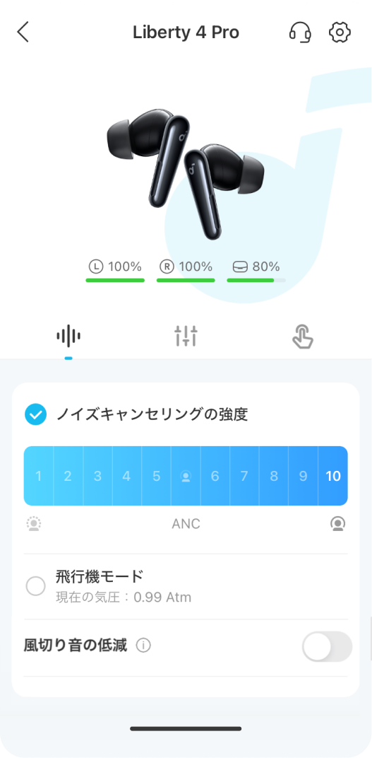 飛行機モード:気圧に合わせてノイズキャンセリングを最適化ケース操作が可能な機能