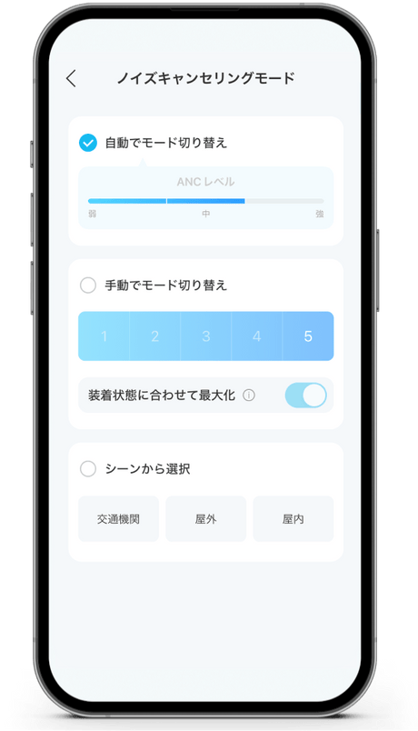 騒音レベルに応じてノイズキャンセリングの強さを自動で調節し、