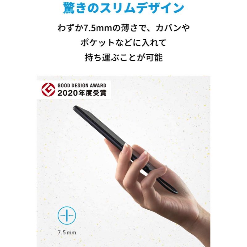Anker PowerCore III Slim 5000 with Built-in Lightning Cableは、わずか7.5 mmの薄さと目を引くドット柄のデザインで今までにない携帯性を実現しました。内蔵型ケーブル