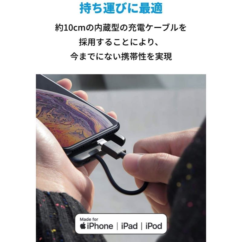 もう充電ケーブルを忘れてしまっても心配はありません。ライトニングケーブルを内蔵しているため、いつでもどこでもこれひとつで充電が可能です。幅広い対応機種