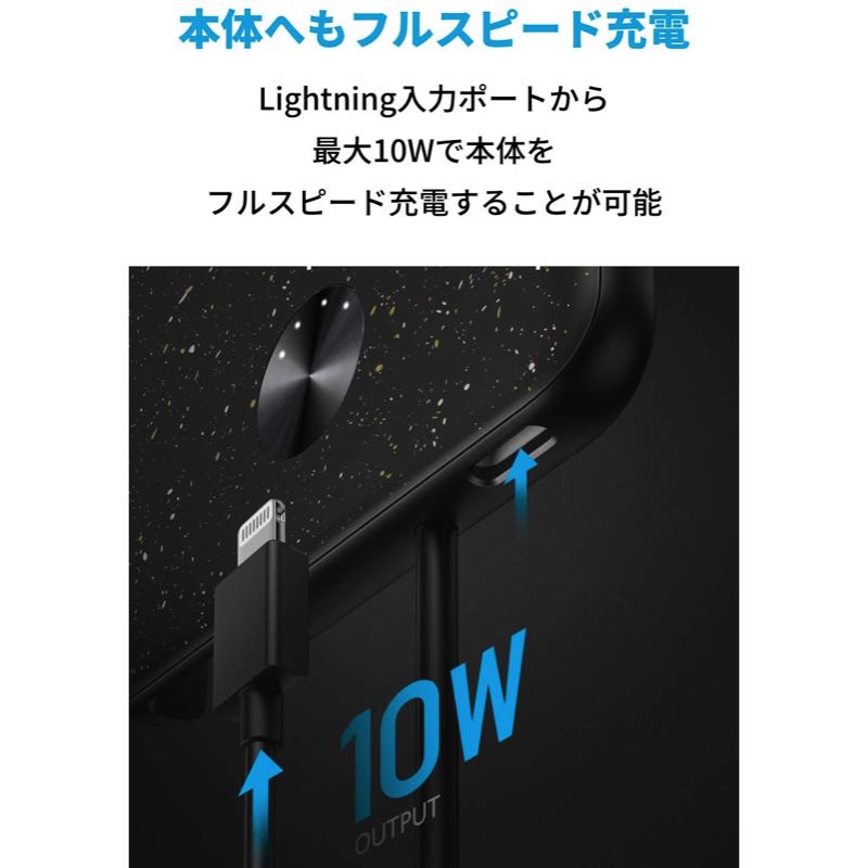 ライトニング入力ポートから最大10Wで本体をフルスピード充電することが可能です。持ち運びに最適