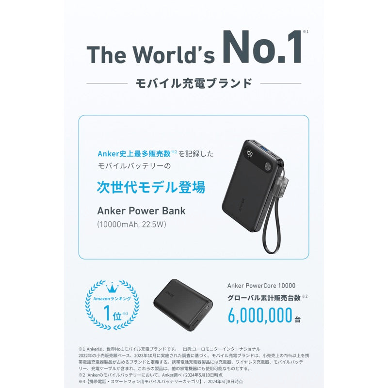 パッケージ内容 Anker Power Bank (10000mAh, 22.5W) 、USB-C & USB-C ケーブル、ストラップ、クイックスタートガイド、18ヶ月保証 + 6ヶ月 (Ankerで会員登録後) 、カスタマーサポート