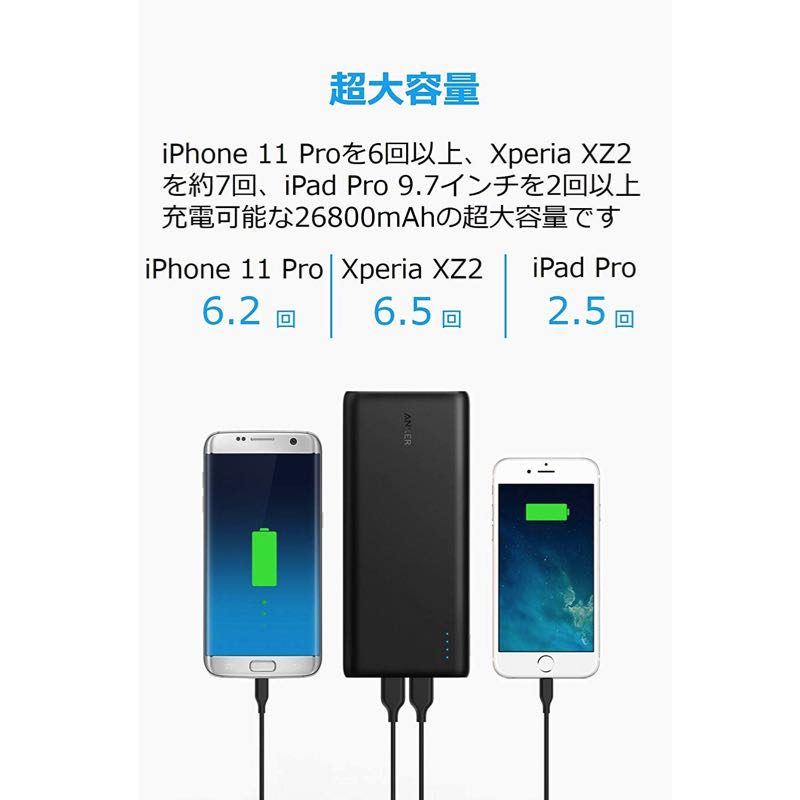 | パッケージ内容 | Anker PowerCore 26800、2 x Micro USBケーブル、取扱説明書、18ヶ月保証 + 6ヶ月 (Ankerで会員登録後) 、カスタマーサポート |