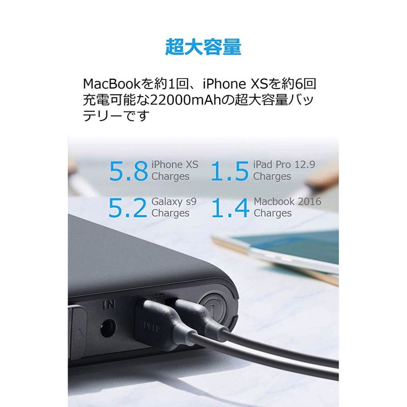 22000mAhの大容量により、MacBookに約1回の充電が可能で、他のノートパソコンへも十分なバッテリーを供給します。iPhone XSに約6回、その他ほとんどのスマートフォンに5回以上、タブレット端末にも1回以上の充電が可能です。