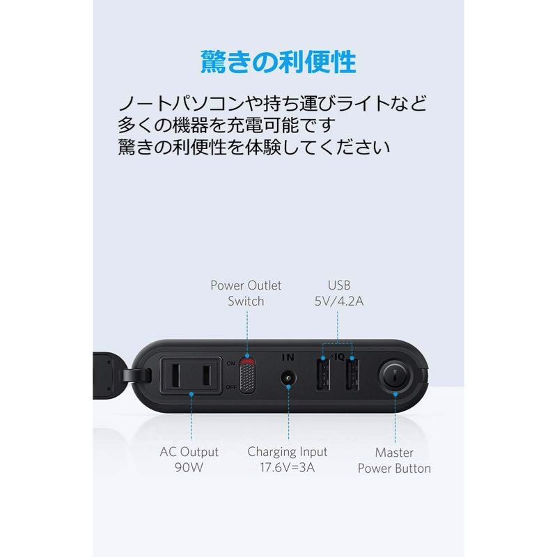 | 出力 | AC出力:110V = 60Hz, 0.79A, 90W USB出力:5V=4.2A (各ポート最大3A) |