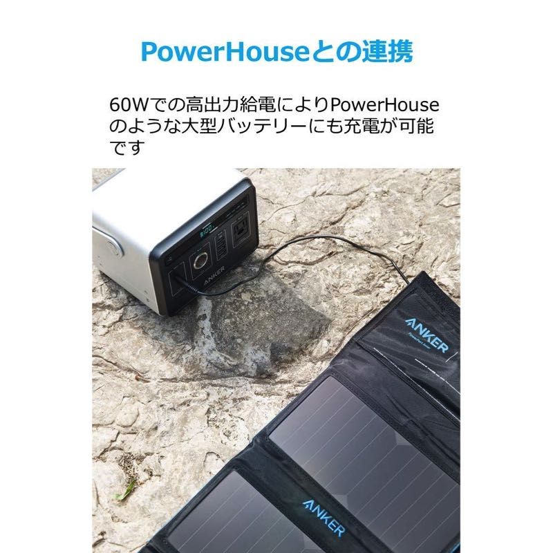 Ankerの大人気製品、Anker PowerHouseを充電できる高出力ソーラーチャージャーです。一般的なUSB機器だけではなく、大型バッテリーも充電することが可能。