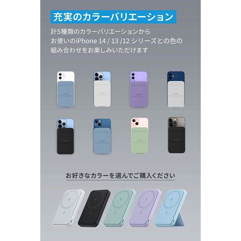 薄さわずか12.8mmのすっきりとしたスリムなデザインで、片手で通話や自撮りなどを楽しめます。超コンパクト設計ながら、5000mAhの容量かつ7.5W出力でiPhone 14 / 13 / 12シリーズへ約1回充電が可能です。※iPhone 14 / 14 Plus / 14 Pro / 14 Pro Max / 13 / iPhone 13 Pro / 13 Pro Max への満充電回数は1回未満になります (Anker調べ) 。充実のカラーバリエーション