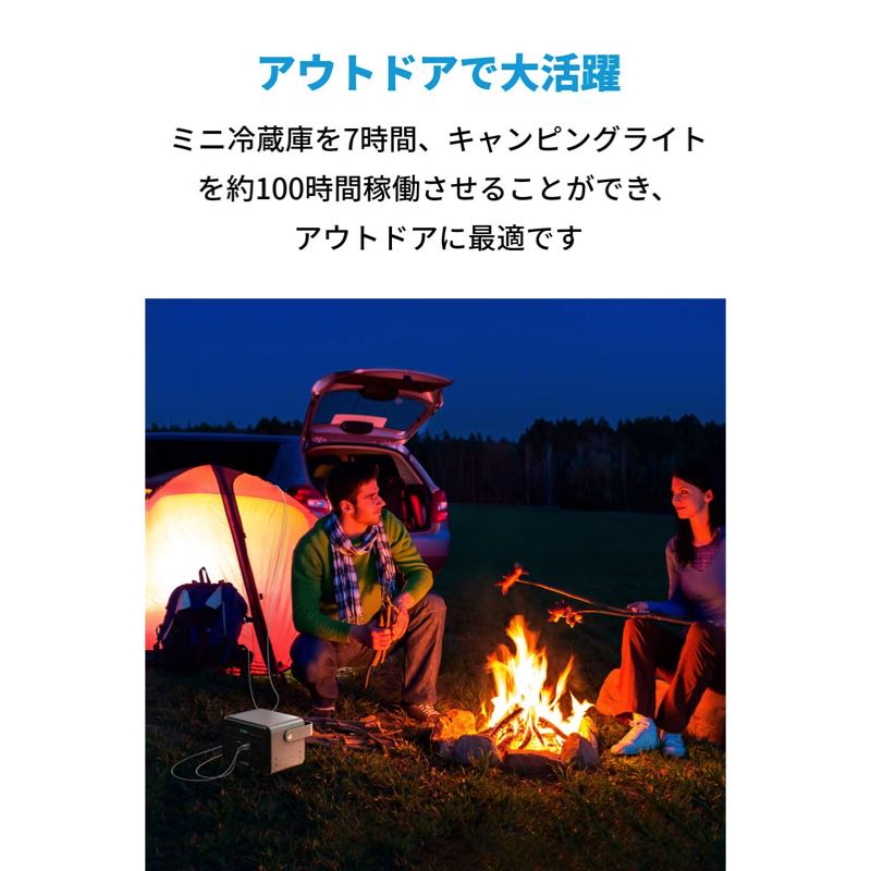 ミニ冷蔵庫を約7時間、キャンピングライトを約100時間稼働させることができ、キャンプ、車中泊、アウトドアなどにも最適です。