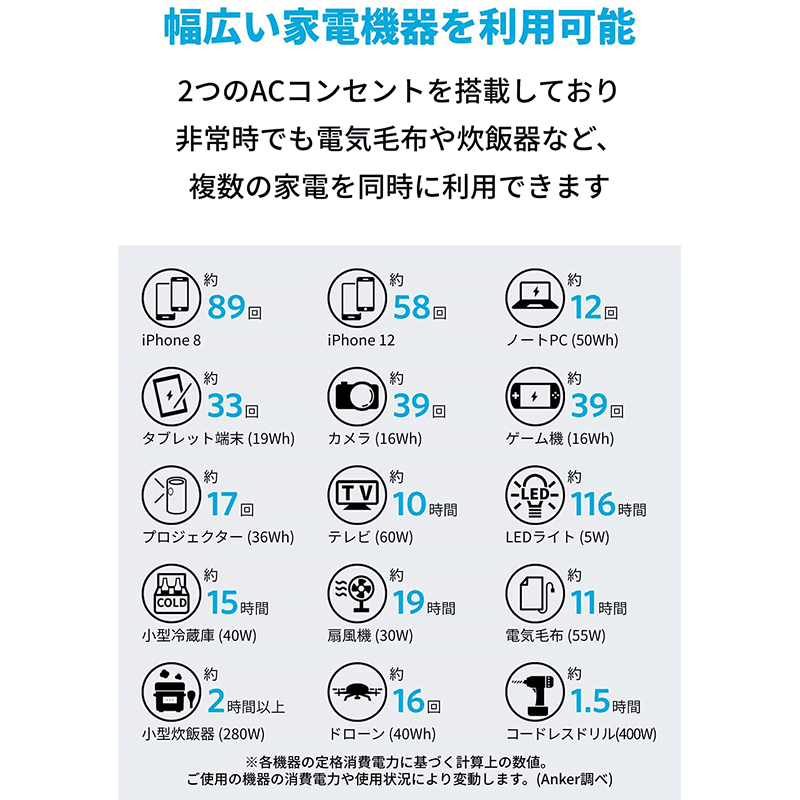 電気毛布と小型冷蔵庫など2つの家電を使用しながら、USB-Aでスマホやゲーム機を、一方でUSB-CはMacBookなどのノートPCを同時に充電&給電でき、家族や友人などみんなで一緒に使えます。
