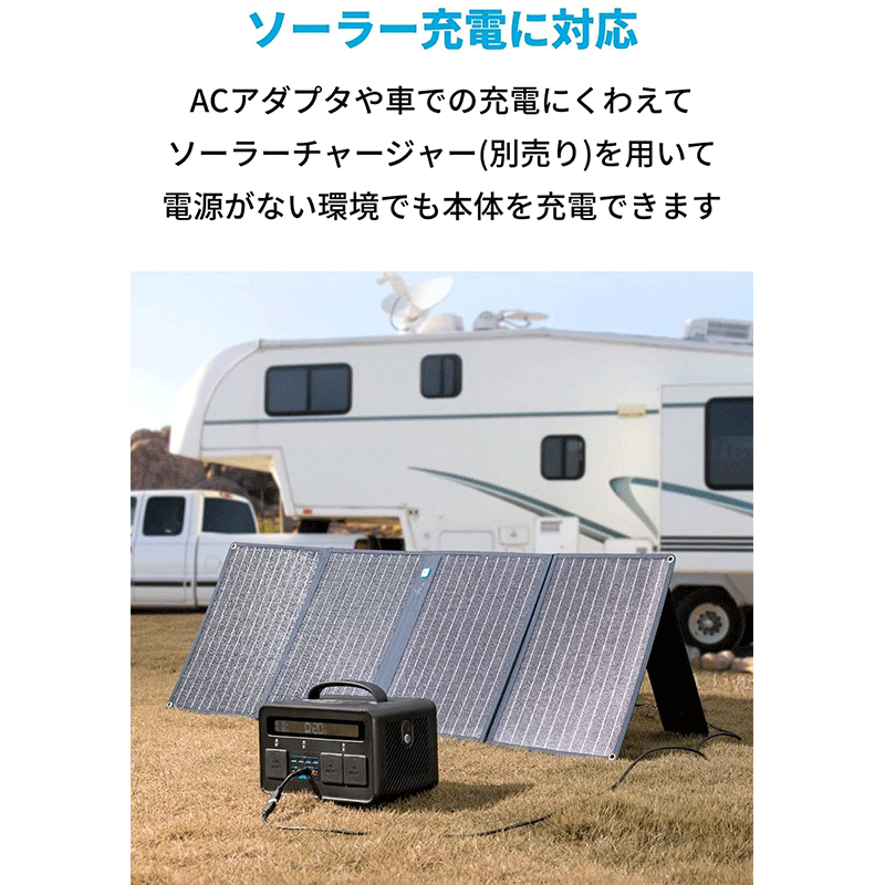 付属のACアダプタからの充電以外に、ソーラーチャージャー「Anker PowerSolar 3-Port 100W」 (別売り) を用いて屋外で充電したり、付属のケーブル内蔵カーチャージャーを用いて車内のカーソケットからで充電できます。さらに、USB充電器 (別売り) を用いてUSB-Cポートからの充電にも対応。付属のACアダプタと2つのUSB-Cポートから同時に充電すればわずか5時間で満充電できます。
