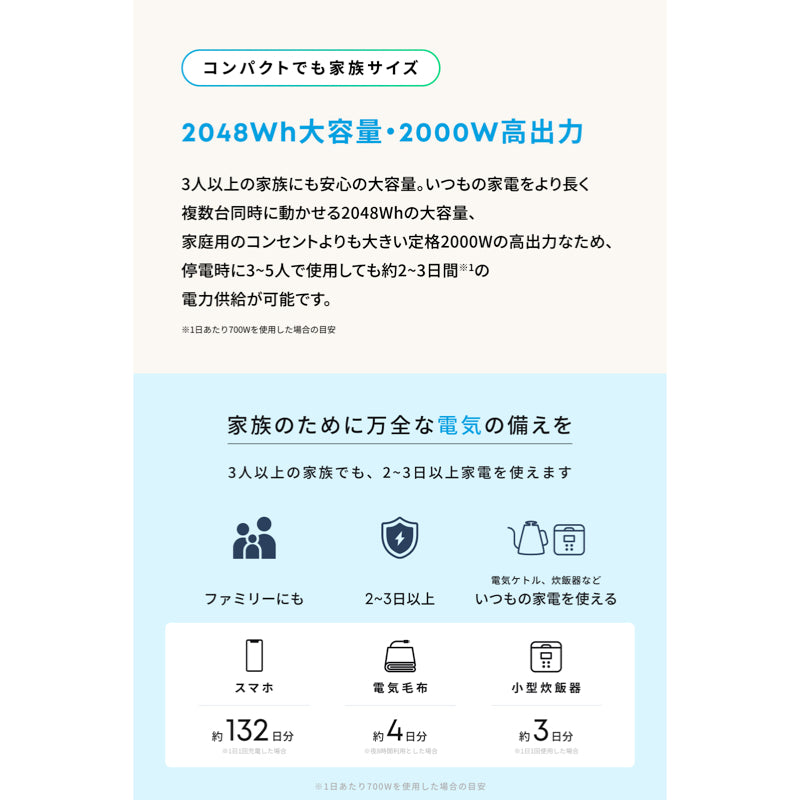 2048Whの大容量、家庭用のコンセントよりも大きい定格2000Wの高出力なため、停電時に3~5人で使用しても約2~3日間※の電力供給が可能です。