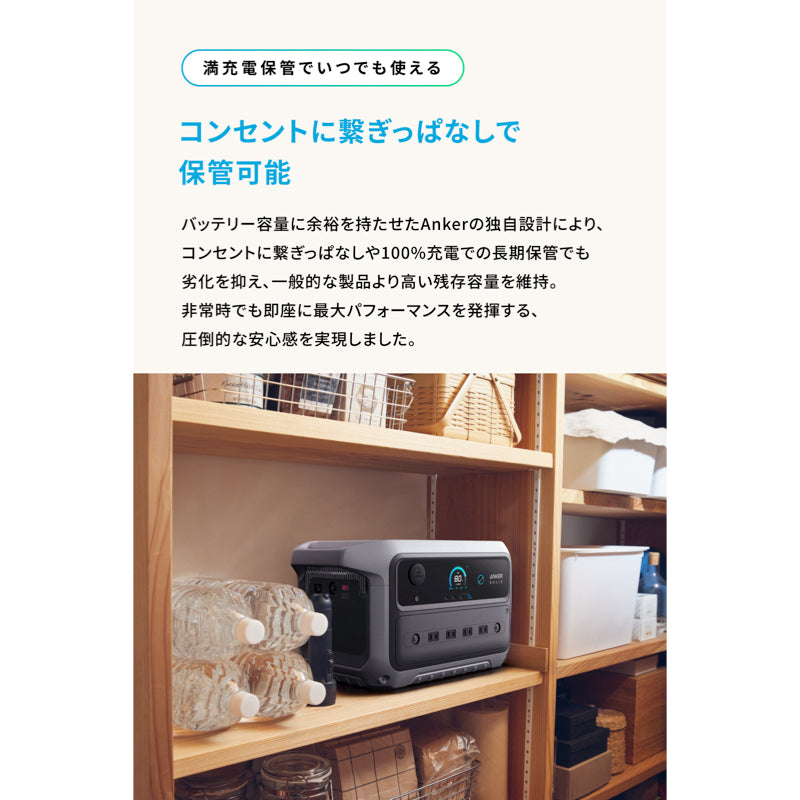 停電時に約0.02秒で自動切り替えする機能により、バックアップ電源としてご使用いただけます。Anker独自の過充電保護機能により、コンセントに繋いだままで保管可能です。