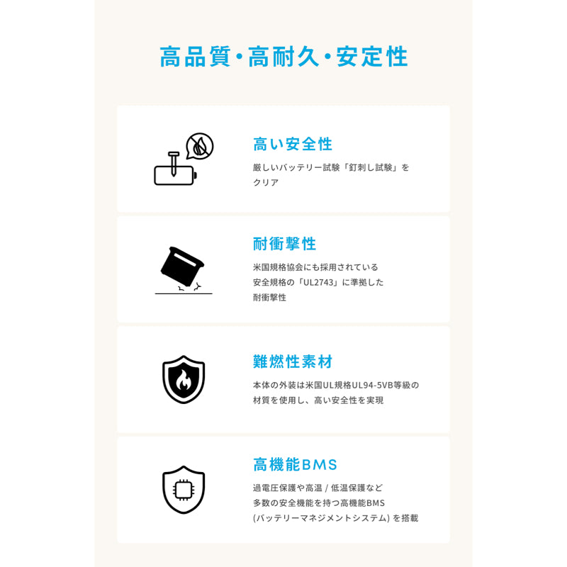 ※電池容量が初期容量の80%まで劣化するまでのサイクル回数は4,000回以上、電子部品の寿命は50,000時間を誇り、適切な利用方法および環境下においては、1日1回ご利用いただいても約10年以上に渡り正常な状態を保ちます