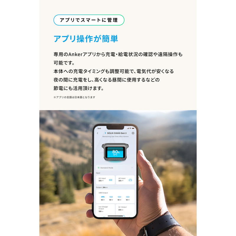 Anker アプリから充電・給電状況の確認や、遠隔での入力スピード操作が可能。更に電気料金が安い時間帯に充電し、高い時間帯に放電して電気を使う、TOU機能を搭載し電気代の節約・最適化ができます。