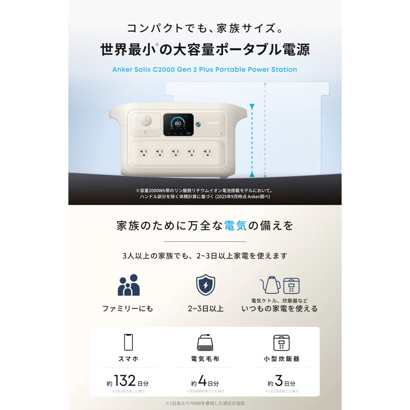 2000Wh帯で世界最小※1サイズを実現。変換効率を改善し、一般的な2000Wh帯より最大約3倍※2長く家電を使える。Anker独自の急速充電技術HyperFlash™️により、100%満充電までわずか99分。家族の防災に万全の備えが欲しい方に最適な大容量モデルです。