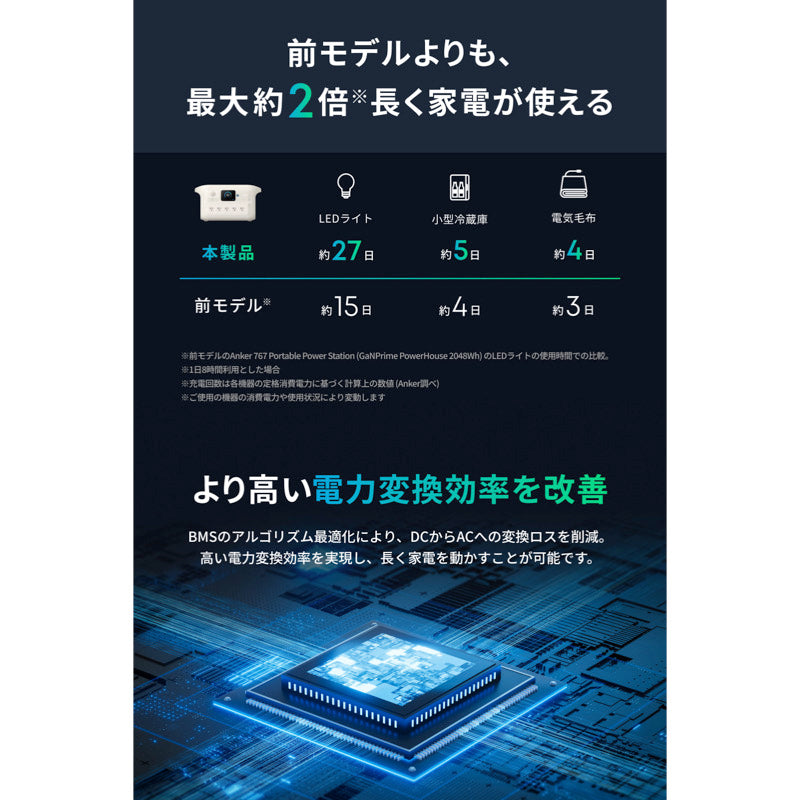 BMSのアルゴリズム最適化により、DCからACへの変換ロスを削減することで、高い電力変換効率を実現しました。これにより前モデルよりも長く家電を動かすことが可能です。