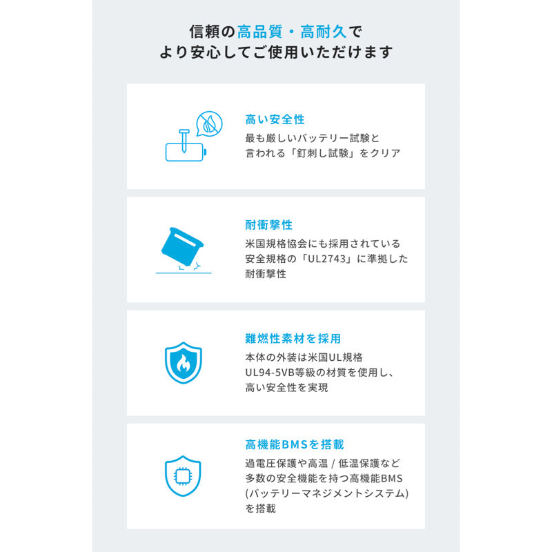 ※電池容量が初期容量の80%まで劣化するまでのサイクル回数は4,000回以上、電子部品の寿命は50,000時間を誇り、適切な利用方法および環境下においては、1日1回ご利用いただいても約10年以上に渡り正常な状態を保ちます
