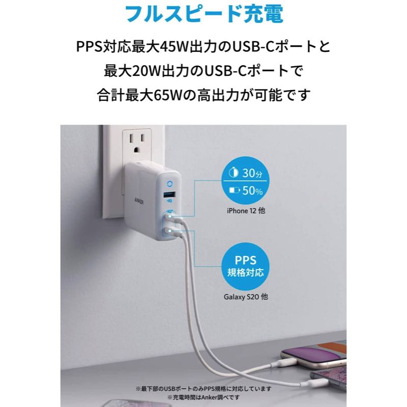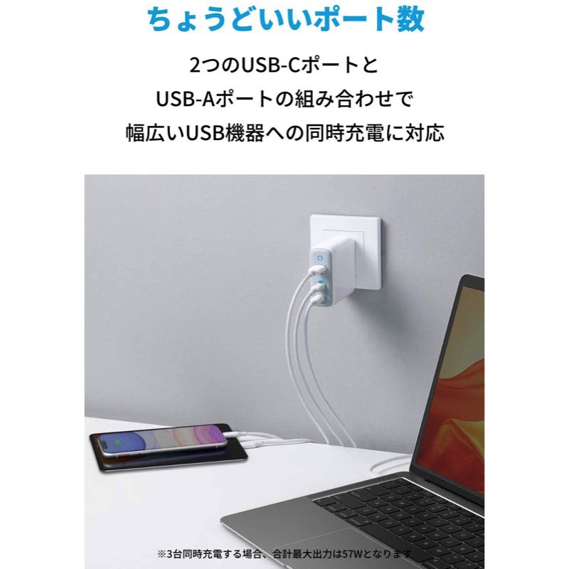 | 合計最大出力 | 65W (2つのUSB-Cポートで同時充電時) / 57W (3ポート同時充電時) |