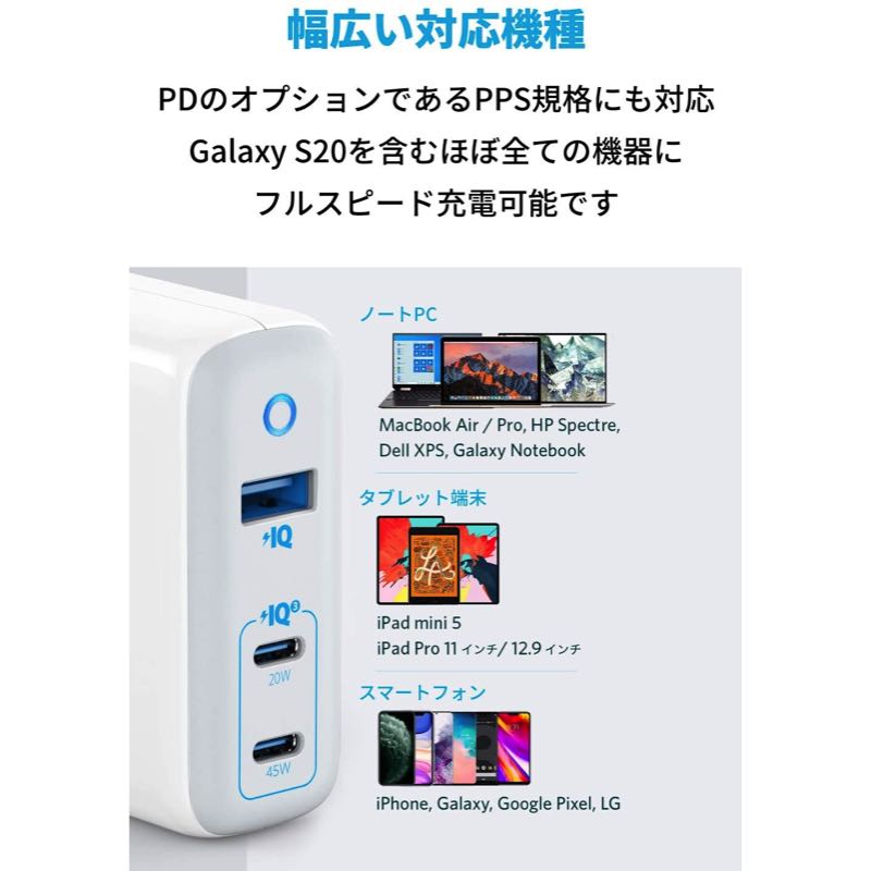 | 出力 | 45W USB-Cポート: 5V=3A / 9V=3A / 15V=3A / 20V = 2.25A / PPS: 3.3V-21.0V=2.15A (最大45W) 20W USB-Cポート: 5V=3A / 9V=2.22A (最大20W) USB-Aポート:5V=2.4A |
