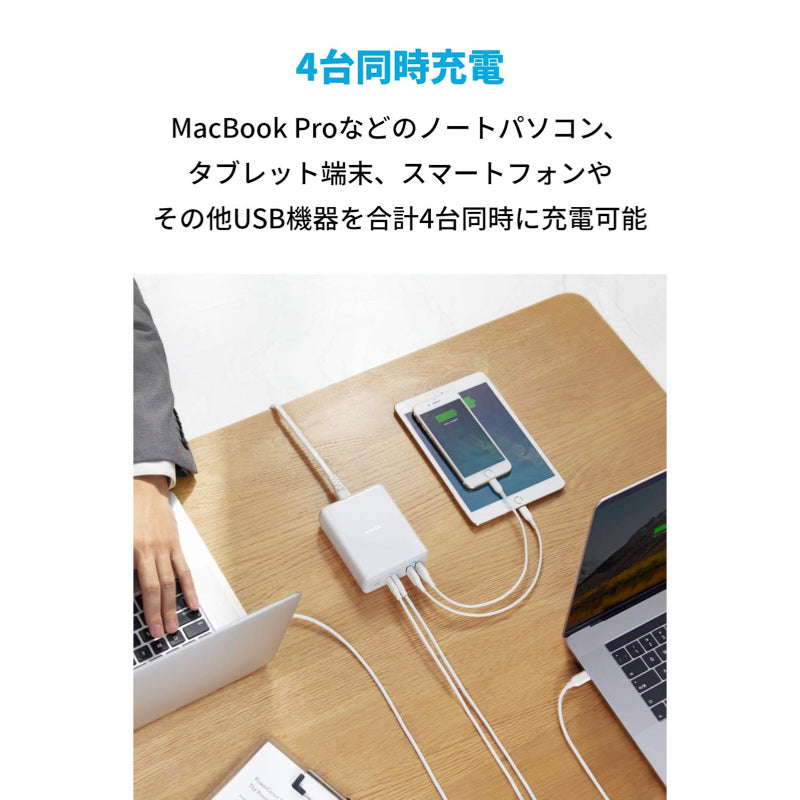 MacBook ProやMacBook Air等のノートパソコン、タブレット端末といったUSB-C機器2台と、スマートフォンやその他USB機器2台の計4台を同時に充電することができます。高い安全性