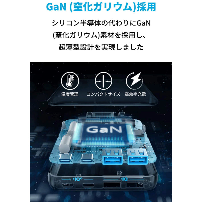 これまで使用していたシリコン半導体に代わり次世代パワー半導体素材「GaN」素材をUSB急速充電器に採用し、超薄型設計にAnker独自の充電技術を詰め込みました。高い安全性