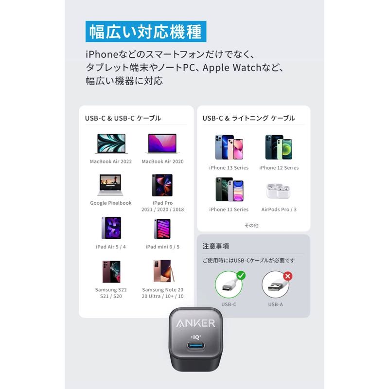 約3.5cm四方より小さい超コンパクトサイズながら最大30W出力でiPhoneやMacBook Airに充電が可能。初めてでも買い替えでも選びやすいモデルです。