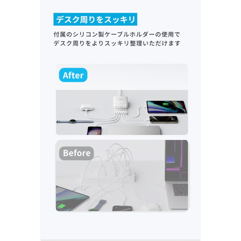 パッケージ内容 Anker Charging Station (6-in-1, 112W) 、ケーブルホルダー、クイックスタートガイド、18ヶ月保証 + 6ヶ月 (Ankerで会員登録後) 、カスタマーサポート