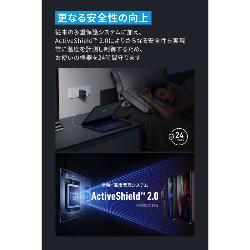 従来の140Wの充電器と比較して約40%の小型化を実現。折りたたみ式プラグ搭載で持ち運びにも便利です。ActiveShield 2.0