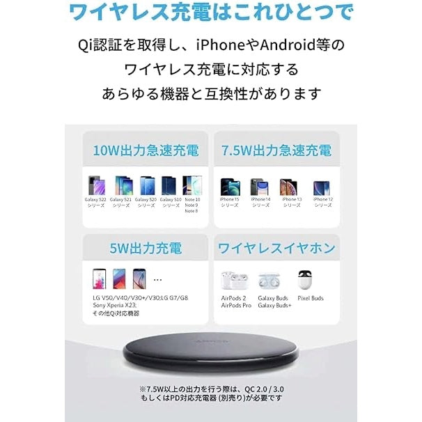 | 対応機種 | 10W 出力急速充電 (QC 2.0 / 3.0対応充電器使用の場合) - Galaxy S22 / S22+ / S21 / S21+ / S20 / S20+ / S20 Ultra / S10 / S10e / S10+ / S9 / S9+ / S8 / S8+ 他 - Note 9 / Note 8 / Note 7 7.5W 出力急速充電 (QC 2.0 / 3.0対応充電器使用の場合) - iPhone 15 / 15 Plus / 15 Pro / 15 Pro Max / iPhone 14 / 14 Plus / 14 Pro / 14 Pro Max / 13 / 13 mini / 13 Pro / 13 Pro Max / 12 / 12 mini / 12 Pro / 12 Pro Max / SE (第3世代) / SE (第2世代) / 11 / 11 Pro / 11 Pro Max / XS / XS Max / XR / X / 8 Plus / 8 他 5W出力 (5V / 2A充電器使用の場合) - AirPods 2 / AirPods Pro 他 - Pixel 6 / 5 / 3 / Pixel 3XL (ディスプレイに「低速充電中」と表示される可能性があります) - 全てのQi対応機種 |