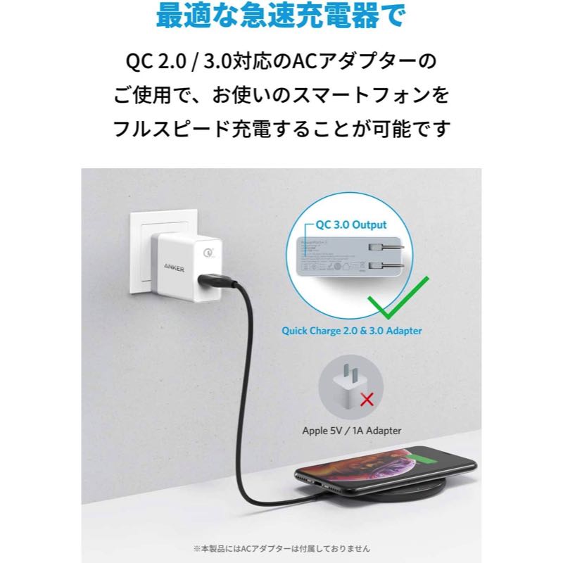 急速充電モードを使用する場合、Quick Charge 2.0/3.0対応急速充電器 (12V対応) が必要です。標準充電モードを使用する場合も5V/2A出力以上の充電器が必要です。また、本製品はApple製スマートフォンに付属の充電器 (5V/1A出力) には対応していませんのでご注意ください。