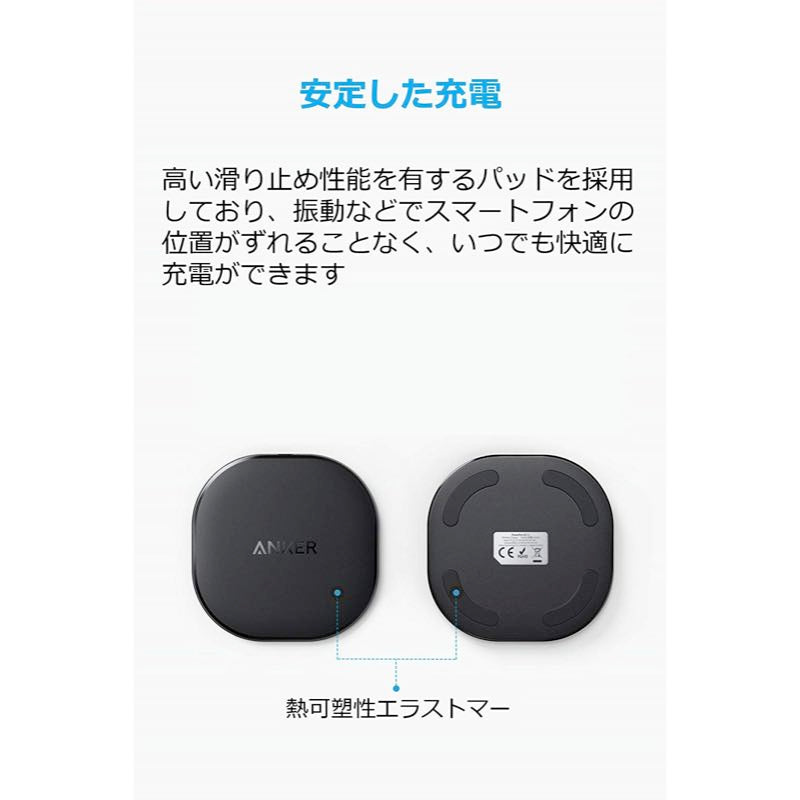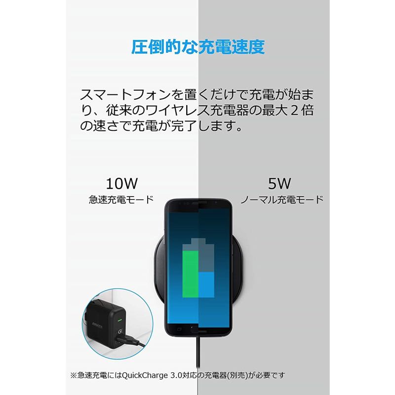| ご注意 | ・本製品への給電には5V/2A以上の出力の充電器をご使用ください。また、10W急速充電モードを使用する場合、Quick Charge対応の充電器をご使用ください。 (「Anker PowerPort 2 Quick Charge 3.0」がおすすめです) |
