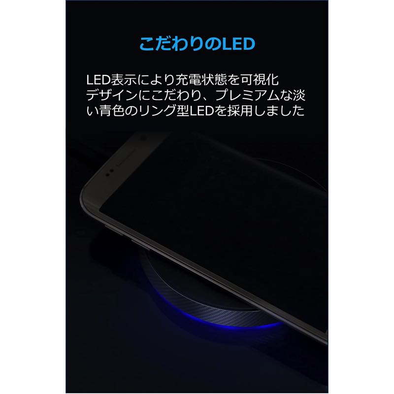 LEDリングは充電状況を一目で確認することができます。また不要な場合にはLEDをオフにしてお使いいただけます。また、滑り止め素材を使用しているので、スマートフォンが誤ってずれてしまうこともありません。