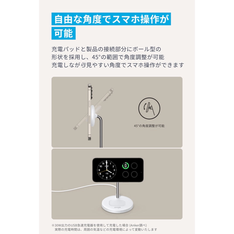 マグネット式ワイヤレス充電対応のスタンド型ワイヤレス充電器。Qi2対応のiPhone※に、最大15W出力で2倍速くワイヤレス充電が可能です。特設LPはこちら