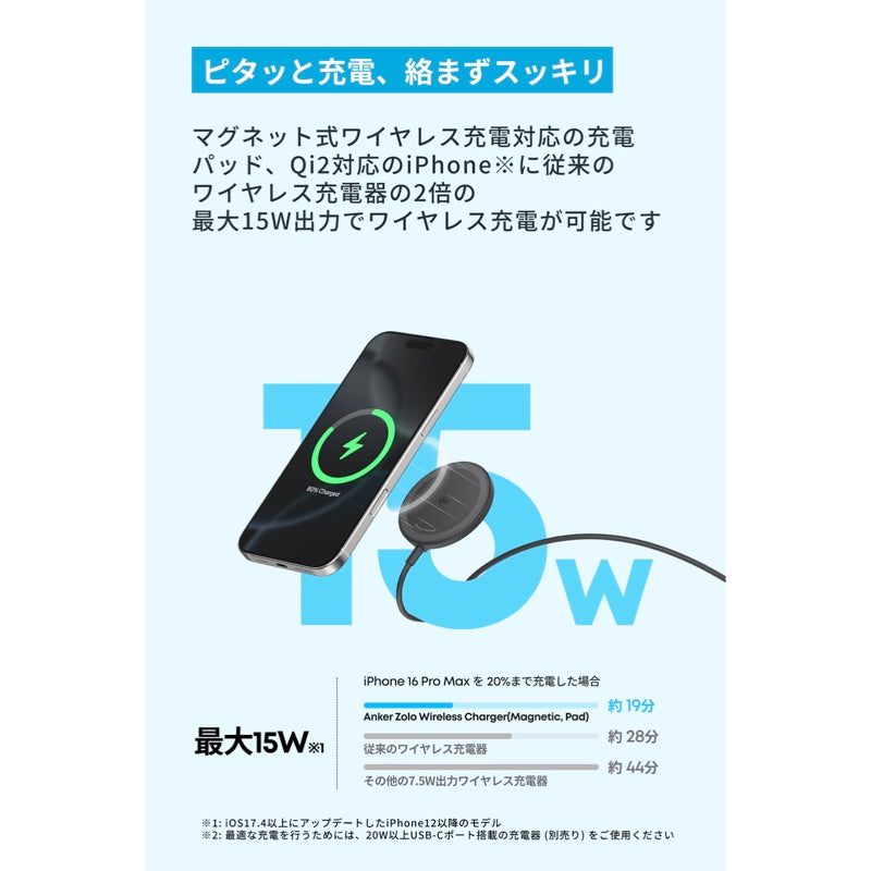マグネット式ワイヤレス充電対応の充電パッド、Qi2対応のiPhone※に従来のワイヤレス充電器の2倍の最大15W出力でワイヤレス充電が可能です。(※: iOS17.4以上にアップデートしたiPhone12以降のモデル)
