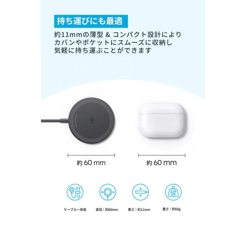 パッケージ内容 Anker Zolo Wireless Charger (Magnetic, Pad) 、取扱説明書、24ヶ月保証 + 6ヶ月 (Ankerで会員登録後) 、カスタマーサポート