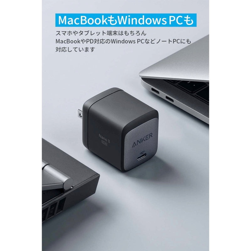 USB PowerDelivery (PD) 対応の65W出力で、スマートフォンからノートPCまで幅広い機器に急速充電できるUSB充電器です。利用機器毎に異なる充電器を持ち運ぶ必要はありません。 MacBookやPD対応のWindows PCにも対応: 最大65W出力を備え、MacBookだけでなく、PD対応のさまざまなWindows PCにも急速充電できます。一般的なWindows PCに同梱されているACアダプタに比べて非常に軽量かつコンパクトなため、カフェや自宅などでのリモートワークでも快適にご使用いただけます。超コンパクト設計
