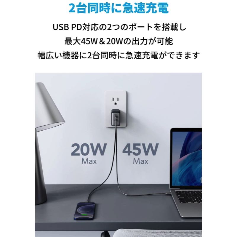 USB PD対応の2つのポートを搭載し、最大45W&20Wの出力が可能。幅広い機器に2台同時に急速充電ができます。