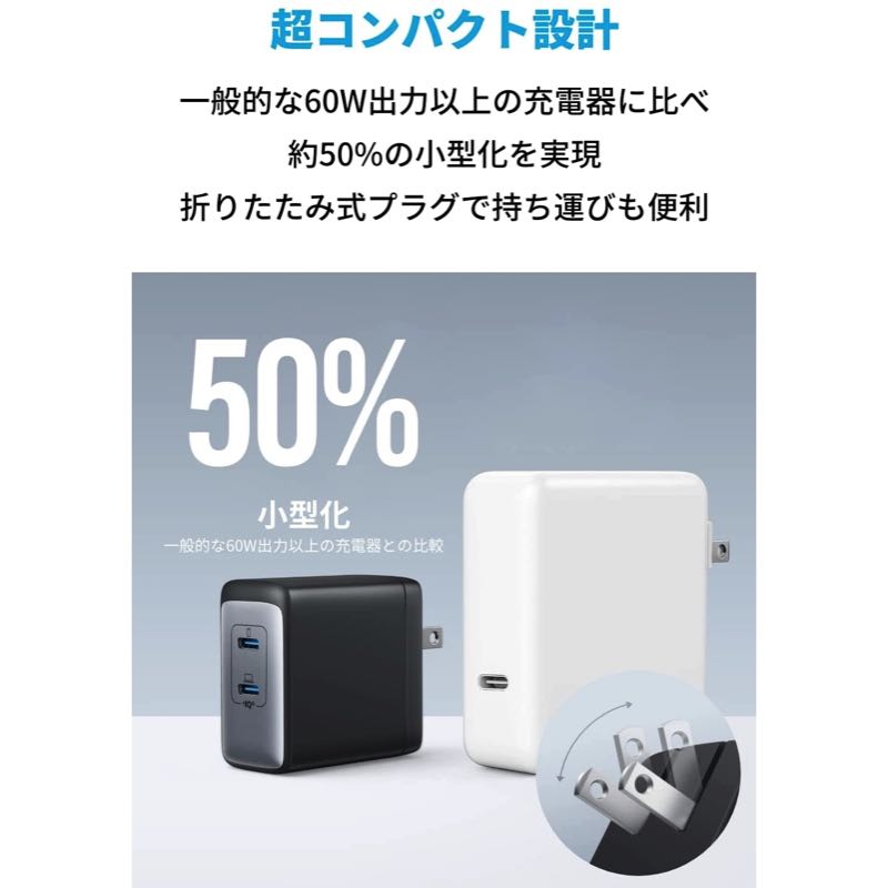 一般的な60W出力以上の充電器に比べ、約50%小さなコンパクトサイズを実現。折りたたみ式プラグを採用し、どこにでも気軽に持ち運ぶことができます。独自技術「Anker GaN II」採用