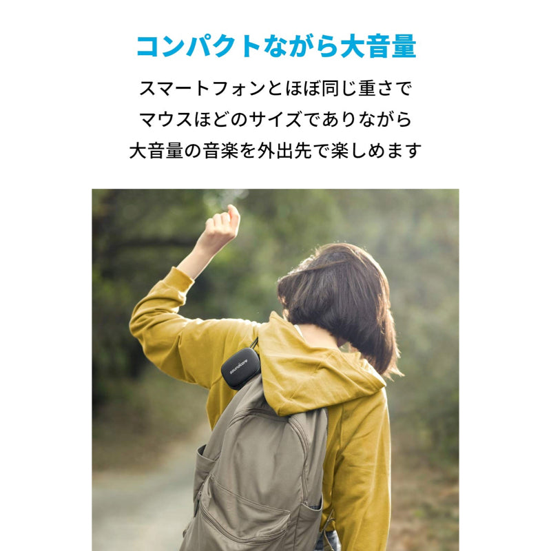 スマートフォンとほぼ同じ重さでマウスほどのサイズでありながら、大音量の音楽を外出先でもお楽しみいただけます。
