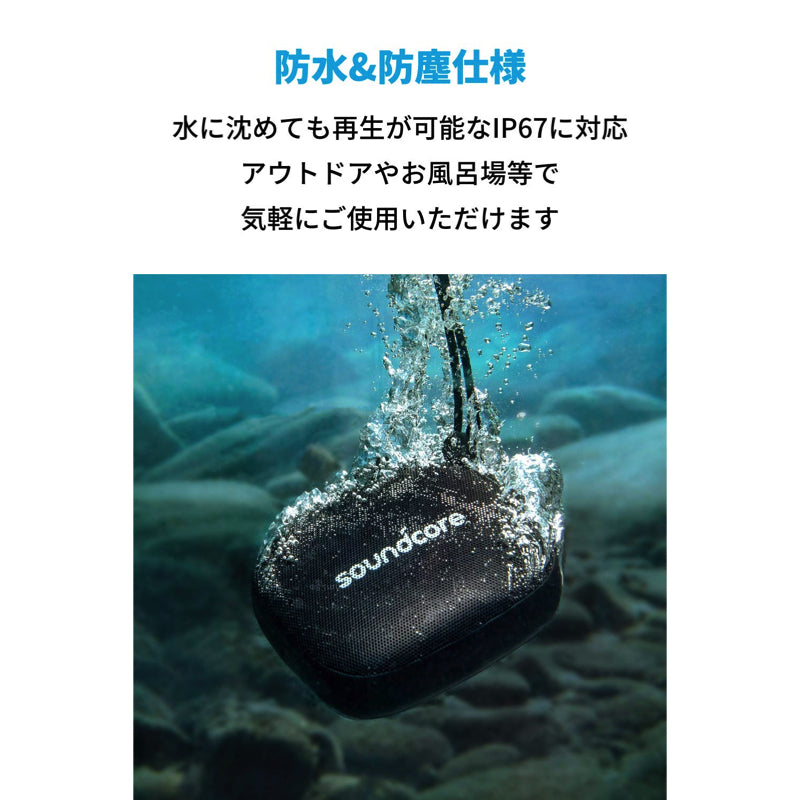 水に沈めても音楽再生が可能なIP67に対応。雨やほこり、泥、雪等を気にすることなく、アウトドアやお風呂場等で気軽にご使用いただけます。(水洗いも可能)