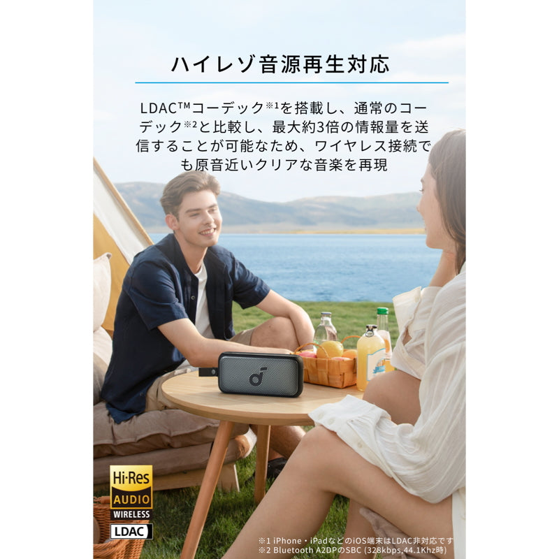 持ち運びやすいデザインと取り外し可能なストラップに加え、製品の角部は約5mmのプラスチック+TPEソフトゴム素材でカバーし、衝撃への強度を高めました。また、最⻑30分間であれば水深1mまで沈めても操作可能なIPX7対応の防水規格で、プールや登山、BBQなどのアウトドアでも気軽にお気に入りの音楽を堪能できます。