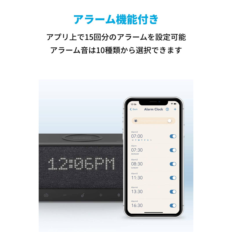 2つのフルレンジドライバーを搭載し、バランスの取れた10Wのパワフルなサウンドをお届けします。Bluetooth接続による音楽再生やPodcastのストリーミング再生も可能です。またSoundcoreアプリを使用するとFMラジオ局 (最大10局) を保存し、気軽にラジオを聴くこともできます。睡眠モード