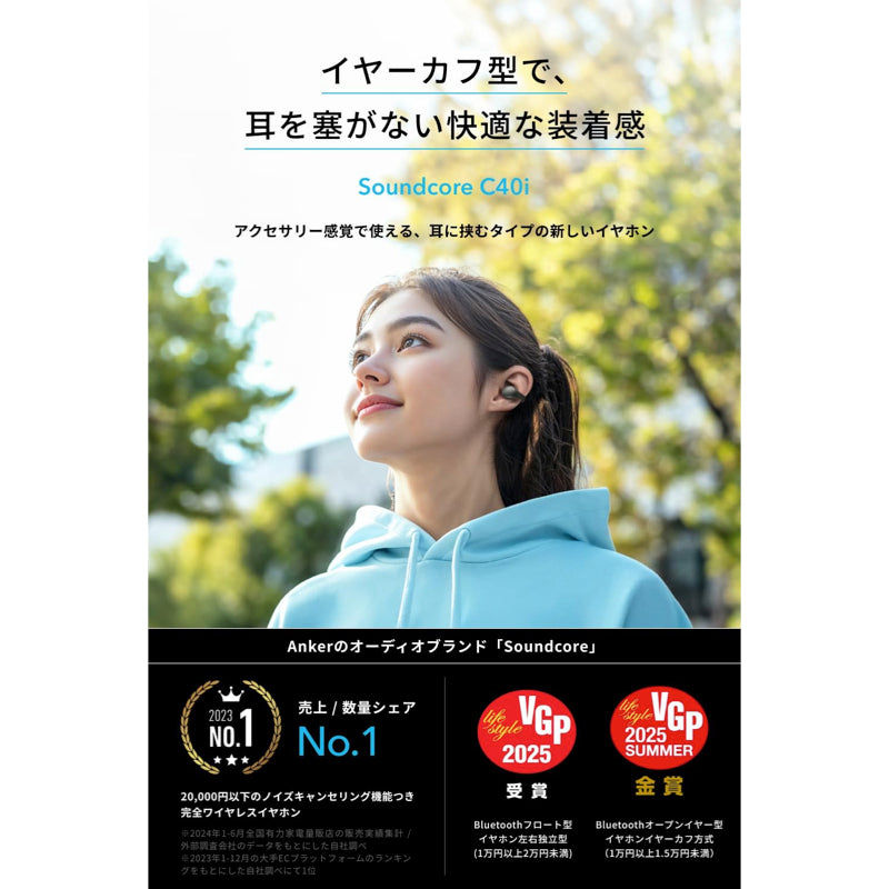 | パッケージ内容 | Soundcore C40i、充電ケース、USB-C & USB-A ケーブル、M / L イヤーカフキャップ、クイックスタートガイド、18ヶ月保証 + 6ヶ月 (Ankerで会員登録後) 、カスタマーサポート |