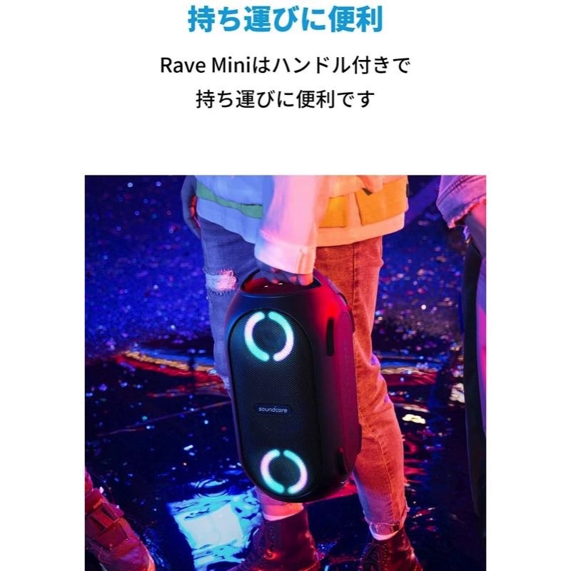 | パッケージ内容 | Anker Soundcore Rave Mini、ACアダプター、変換プラグ (Cタイプ / BFタイプ)、クイックスタートガイド、安全マニュアル、18ヶ月保証 + 6ヶ月 (Ankerで会員登録後) 、カスタマーサポート |