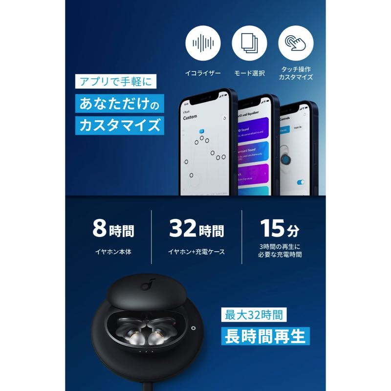 Soundcoreアプリを使用することで、各種モードの選択や、イコライザー設定、イヤホンのタッチ操作のカスタマイズができます。また、3Dオーディオ機能や風切り音低減モードもアプリから起動できます。