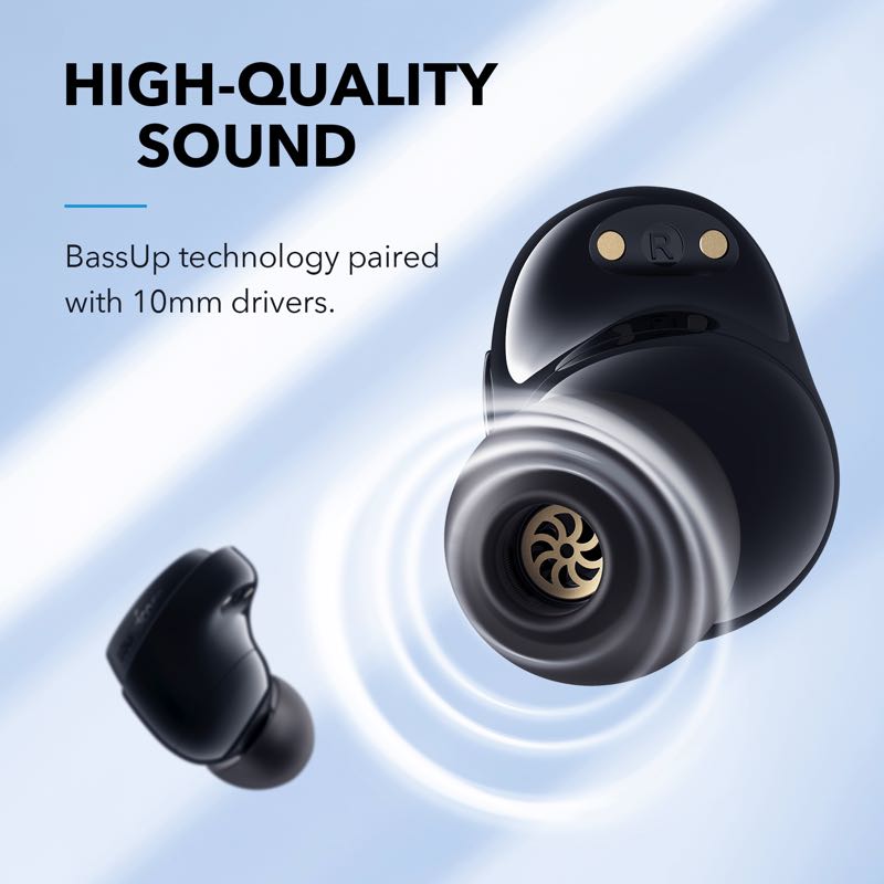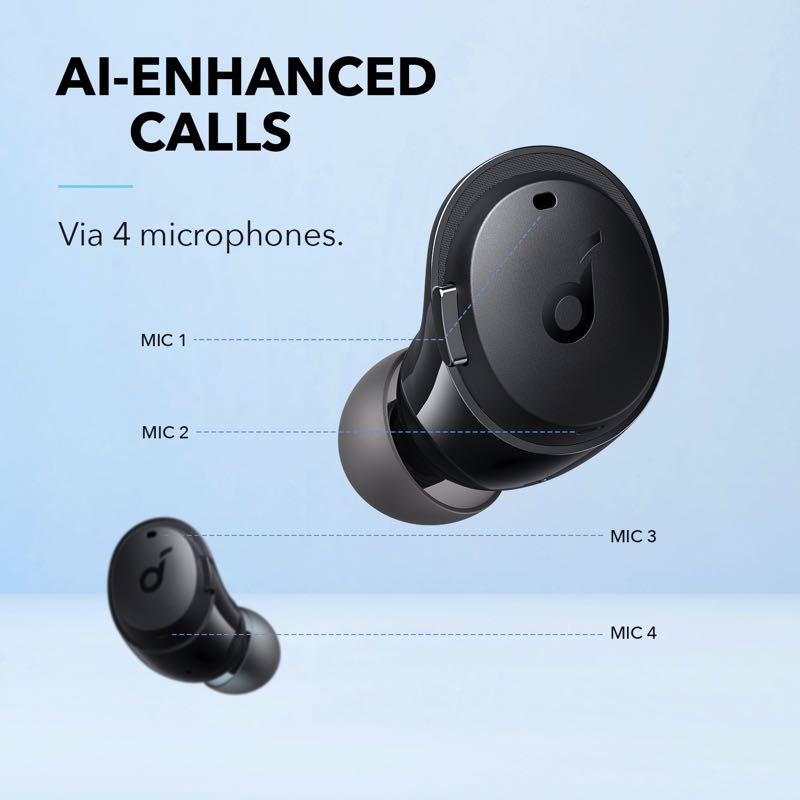 AIノイズリダクション機能を搭載した4つ(左右のイヤホンに各2つ)のマイクが周囲の雑音を除去し、通話相手にあなたの音声をより大きくクリアに伝えます。テレワークやWEB会議にもおすすめです。パワフルなサウンド