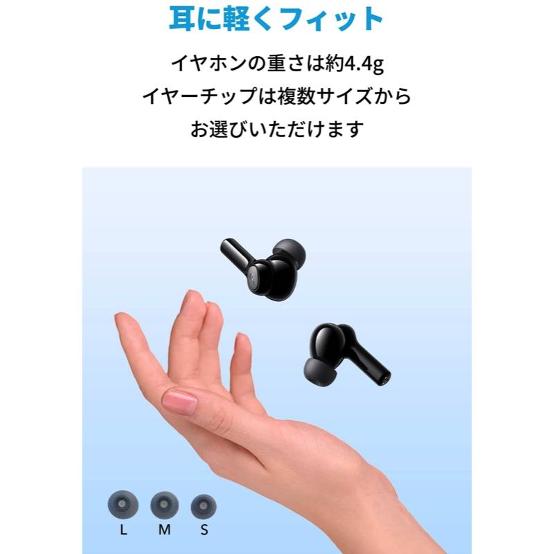 イヤホンの重さは約4.4g。長時間装着していても疲れにくい軽さです。また、イヤーチップを複数サイズ用意しており、ご自身の耳のサイズに合ったものをお選びいただくことで快適にご使用いただけます。製品仕様