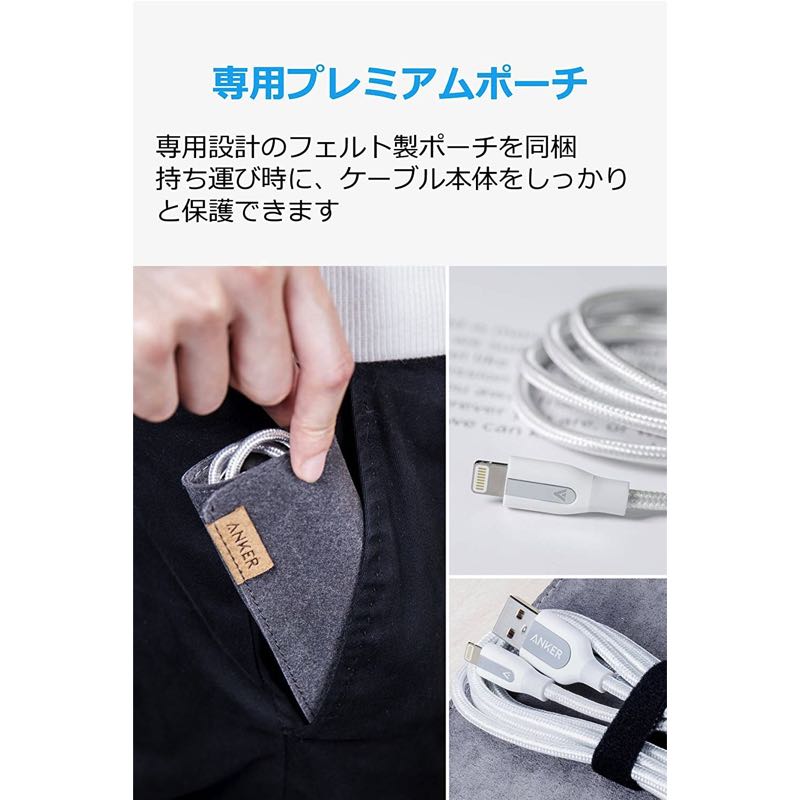 パッケージ内容 Anker PowerLine+ ライトニングケーブル、フェルト製ポーチ、18ヶ月保証 + 6ヶ月 (Ankerで会員登録後)、カスタマーサービス